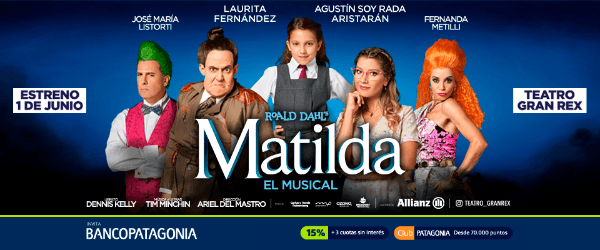 La obra está protagonizada por Laurita Fernández, Agustín “Soy Rada” Aristarán, José María Listorti, Fernanda Metilli y tres elencos de talentosos niños de entre 9 y 12 años. Dirigida por Ariel Del Mastro, esta producción de Roald Dahl’s Matilda, el musical cuenta con más de 25 actores en escena cantando y bailando en vivo.