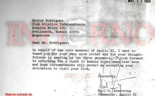 A casi un mes del despegue, un 23 de mayo de 1969, Neil Armstrong envió una carta enagradecimiento al gesto del Rojo. “Estimado señor Rodríguez. En nombre de los miembros de la tripulación del Apollo XI, quiero agradecerles por su muy linda carta y por su amabilidad al enviarnos los tres banderines. Deseo volver pronto y visitar Buenos Aires. Y espero que las circunstancias me permitan aceptar su invitación para visitar su club. Sinceramente, Neil Armstrong”.