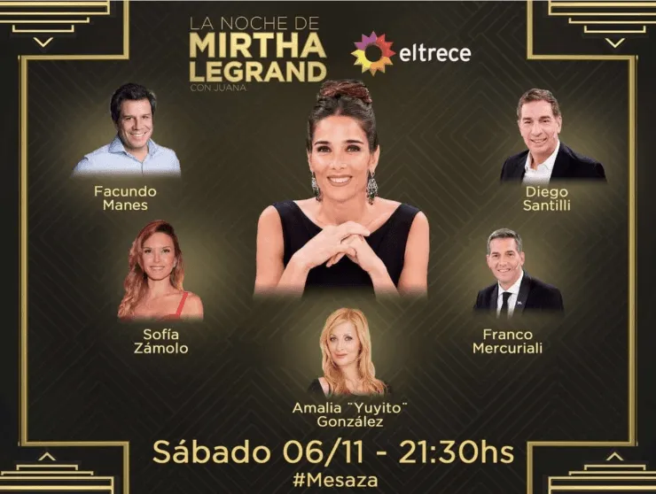 La Noche de ML será transmitida por El Trece el sábado a partir de las 21.30 horas. Al día siguiente, Almorzando con Mirtha Legrand tendrá su mesaza desde las 13.30 horario local y podrá visualizarse por el mismo canal.