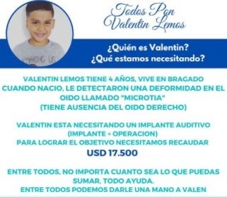 La imagen en cuestión muesta a Valentín, un nene de 4 años de Bragado que sufre de microtía (ausencia del oído derecho) y necesita un transplante con un costo de 17.5 mil dólares.