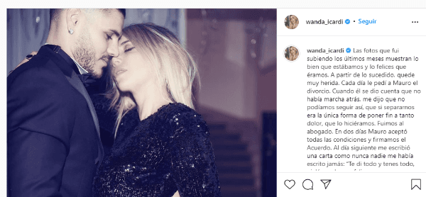 “Cada día le pedí a Mauro el divorcio. Cuando él se dio cuenta que no había marcha atrás, me dijo que no podíamos seguir así, que si separarnos era la única forma de poner fin a tanto dolor, que lo hiciéramos”, reveló Wanda. A continuación, la modelo dio precisiones. “Fuimos al abogado. En dos días Mauro aceptó todas las condiciones y firmamos el Acuerdo”. La pareja del futbolista confesó que existió una separación legal, algo que nadie sabía hasta el momento.