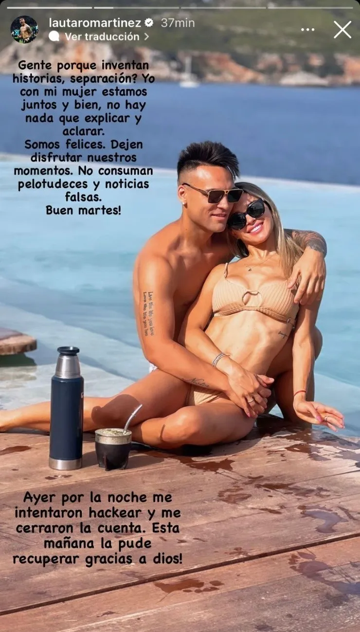 Si bien la primera historia del jugador del Inter sólo decía “Instagram recuperado”, post partido de Champions (ingresó en el segundo tiempo y su equipo ganó 2-0 ante elViktoria Pilsen) el centrodelantero decidió romper el silencio y demostrar que su relación estaba intacta.