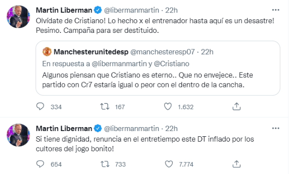 Quien manifestó todo su enojo por la ausencia de CR7 en el clásico de Manchester fue Martín Liberman, ferviente defensor histórico de la leyenda del Real Madrid y del fútbol. “Este atrevido de Ten Hag hace jugar pesimo a su equipo y se da el gusto de dejar a Cristiano como suplente todos los partidos? De donde salió este sujeto deleznable?”, escribió el periodista de ESPN a través de su cuenta de Twitter.