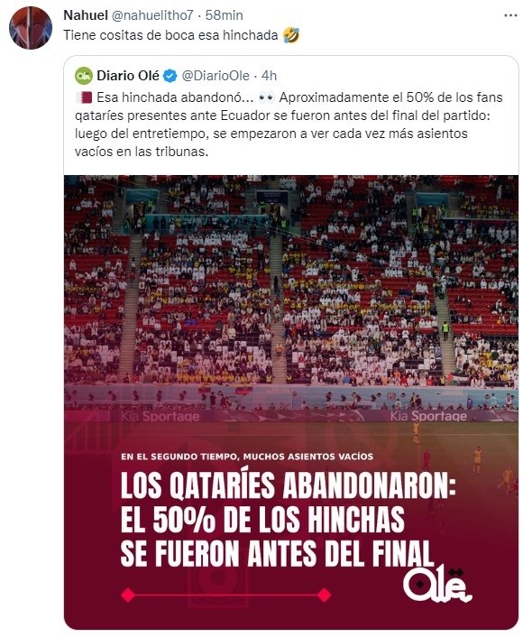 A raíz del resultado adverso y la pésima actuación del combinado asiático, los hinchas qataríes decidieron abandonar el estadio en pleno partido y la capacidad del Al Bayt Stadium quedó cerca del 50% para lo que restaba de segundo tiempo. Sin dudas, imágenes fuertes e inéditas en una Copa del Mundo.