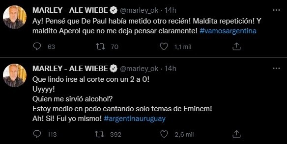De todas formas, Marley quiso aclarar que su apoyo al equipo argentino era una mera cuestión deportiva. “Amo Uruguay, su país, y todo de ustedes. ¡Salvo por estas 2 horas que necesito que ganemos, después vuelvo al amor incondicional! Igual obvio quiero que estén en el Mundial”, señaló.