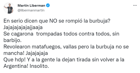 Apenas terminó el partido, en la zona de los vestuarios se desató una batalla campal que involucró dirigentes, personal de seguridad y jugadores. Tras el bochornoso episodio, Boca le comunicó a AFA que la burbuja no se rompió en ningún momento, incluso cuando varios futbolistas fueron trasladados a la comisaría local. Sin embargo, Martín Liberman no coincidió y expresó su ira en Twitter.