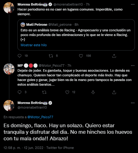 Y si hablamos de análisis en redes, Morena Beltrán es una de las principales caras de ello. En este domingo, donde estuvo muy atenta de los duelos, también se detuvo en felicitar al periodista de Racing, Matías Petrone, por un hilo de Twitter en el que hizo un descargo sobre lo sucedido en la derrota académica por Copa Argentina entre semana ante Agropecuario y las posibles consecuencias que esa derrota podría traerle futbolísticamente al conjunto de Fernando Gago. “Hacer periodismo es no caer en lugares comunes. Imperdible, como siempre“, escribió Morena congratulando a su colega, pero hubo un usuario de la red del pajarito que no se tomó bien su comentario.