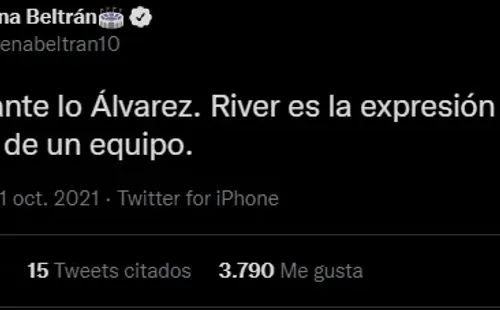 Entre tantos elogios al delantero riverplatense, apareció el de Morena Beltrán, quien apeló a lo emotivo para referirse a él. En su cuenta de Twitter, Morena posteó: “Emocionante lo Álvarez. River es la expresión más completa de un equipo“, esto, al momento de hacer esa corrida que sentenció el resultado.