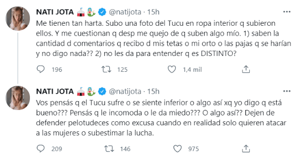Poco después, llegó su descargo: “Me tienen tan harta. Subo una foto del Tucu en ropa interior q subieron ellos. Y me cuestionan q desp me quejo de q suben algo mío. 1) saben la cantidad d comentarios q recibo d mis tetas o mi orto o las pajas q se harían y no digo nada?? 2) no les da para entender q es DISTINTO?”.