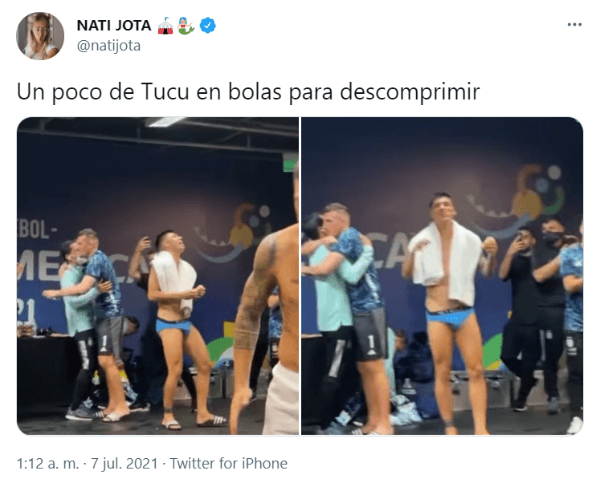 “Un poco de Tucu en bolas para descomprimir“, escribió ella seguramente sin imaginarse que al poco tiempo sería tendencia: algunos le respondieron bancándola, mientras que otros la comenzaron a criticar por mostrar el futbolista de esa manera.