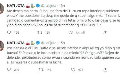 Y siguió: “Vos pensás q el Tucu sufre o se siente inferior o algo así xq yo digo q está bueno??? Pensás q le incomoda o le da miedo??? O algo así?? Dejen de defender pelotudeces como excusa cuando en realidad solo quieren atacar a las mujeres o subestimar la lucha”.