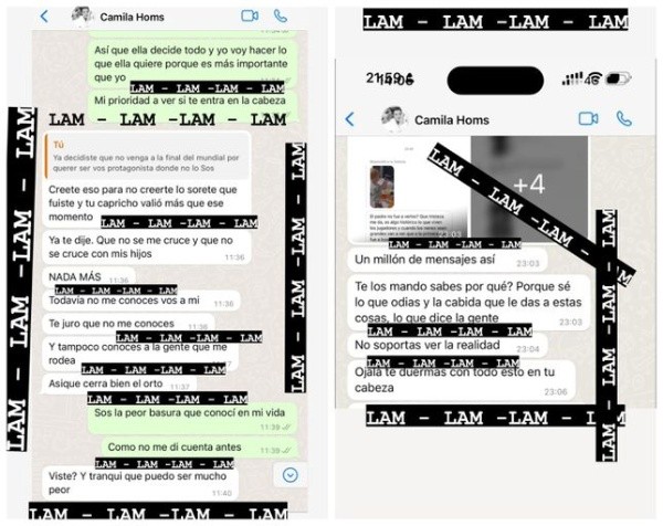 “Merecés lo peor vos. No te pienso cruzar así que no sé cómo harás para ver a tus hijos. Me voy a encargar de que el mundo entero te conozca por lo mierda que sos, más que por ser campeón del mundo. Quedate bien tranquilo. No vas a tener paz“, dice otro de los duros mensajes de Camila para Rodrigo según consta en la denuncia.