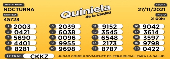 La Quinieladelsábado 27de noviembreya tuvo todos sus sorteos de la Loteria menos uno, el sorteo de La Nocturna. Este podría visualizarseEN VIVO y ONLINE a partir de las 21.00 horasen el streaming oficial de la Lotería de la Ciudad.