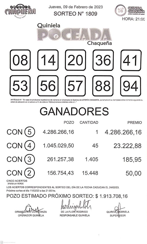 Resultados de la Quiniela Poceada Chaqueña del jueves 9 de febrero 2023