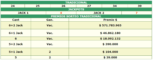 TRADICIONAL: Elegí 6 números en un rango del 0 al 41, más 2 números en un rango del 0 al 9 para el”JACKPOT”, los cuales no se deben repetir. Valor $ 80