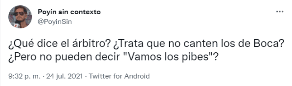 Después de lo sucedido, el Pollo Vignolo se quejó en plena transmisión:“¿Qué dice el árbitro? ¿Trata que no canten los de Boca? ¿Pero no pueden decir ‘Vamos los pibes’?”. El dicho lo levantó la reconocida cuenta de Twitterque recopila los momentos fuera de contexto del relator de FOX Sports Premium.