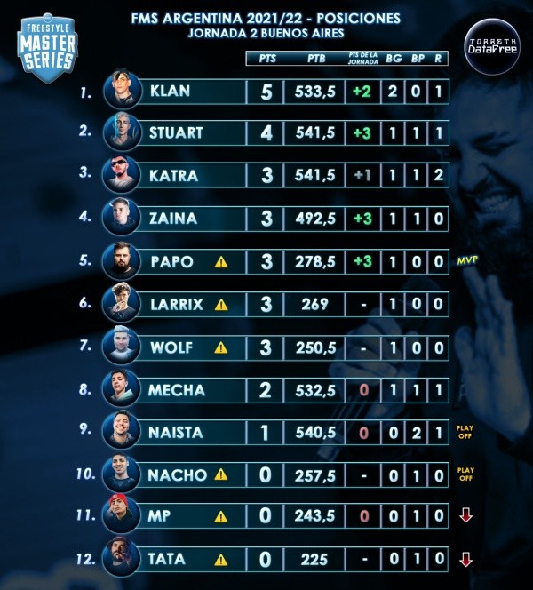 Tras la segunda jornada, Klan se mantiene en lo más alto de la clasificación con cinco unidades, seguido por Stuart, con cuatro. Más atrás, aparecen Katra, Zaina, Papo, Larrix y Wolf, todos con tres.