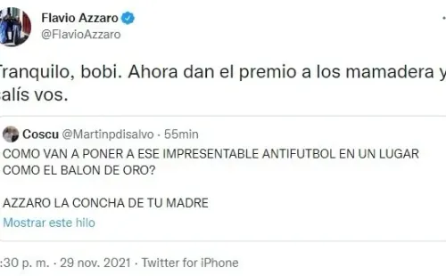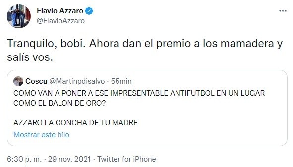 “¿Cómo van a poner a ese impresentable anti-fútbol en un lugar como Balón de Oro? Azzaro la con… de tu madre”, escribió Pérez Disalvo en la red social del pajarito. Rápidamente, su posteo se llenó de Retweets y ‘me gusta’, pero también Flavio Azzaro fue muy veloz y le respondió al streamer.