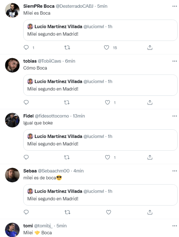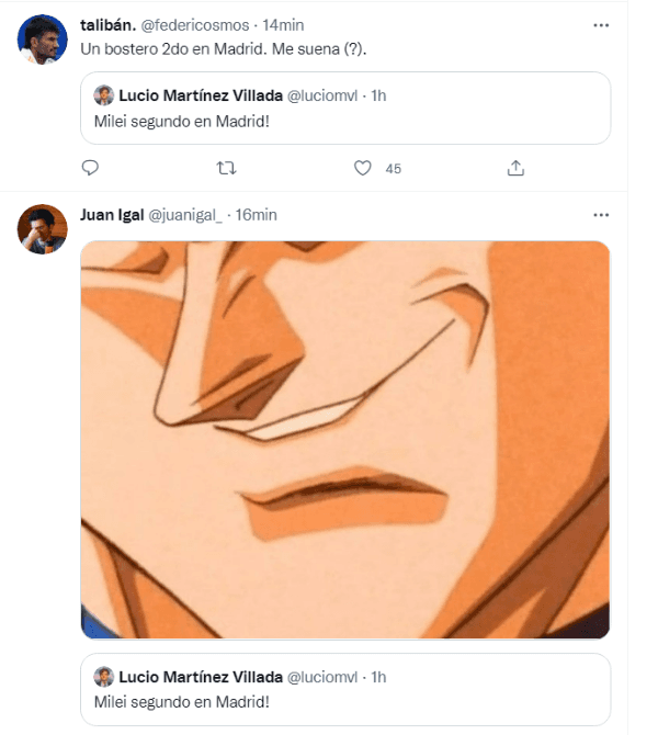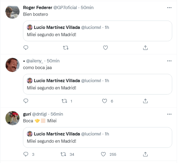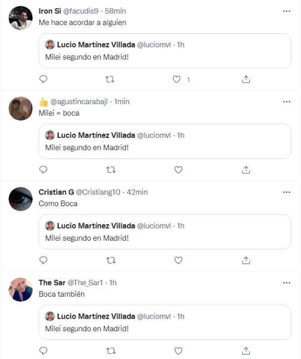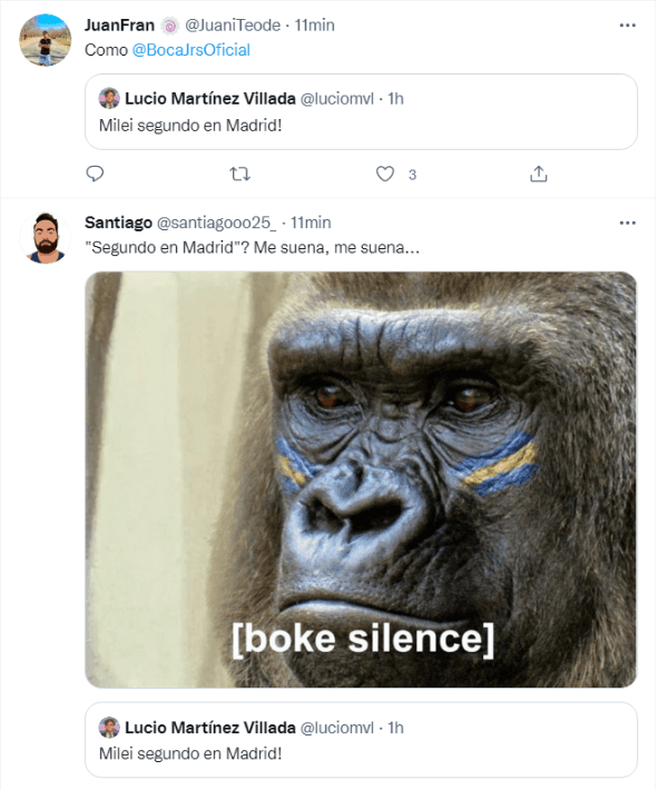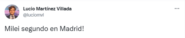 “Milei segundo en Madrid”, posteó el usuario en Twitter para informar a los militantes acerca del desempeño del candidato en la Ciudad de Buenos Aires. Sin embargo, todo fueron risas y chistes por la histórica final que River le ganó al Xeneize hace casi 3 años en el Santiago Bernabéu.