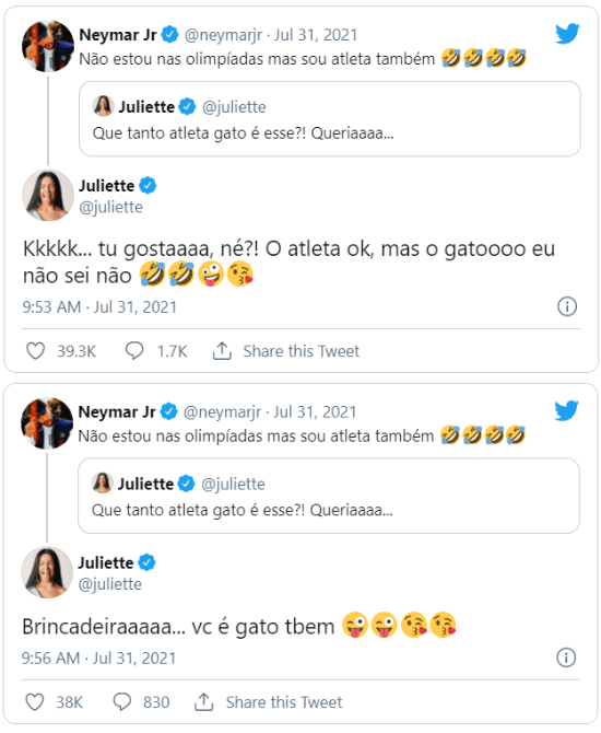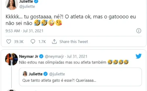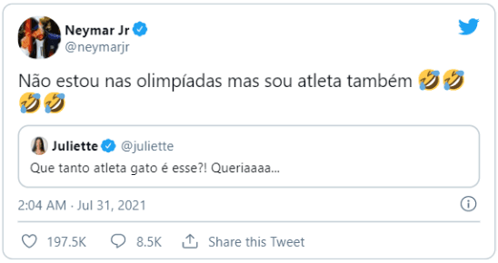 Juliette Freire es la ganadora de Gran Hermano Brasil (allá le dicen Big Brother) y está loca por los Juegos Olímpicos, a tal punto de decir quela gran mayoría de los atletas del evento son “gatos (en portugués se entiende como ‘lindo’)”. El crack del PSG, que este año no participó, le respondió: “No estoy en los Juegos pero soy atleta también”.