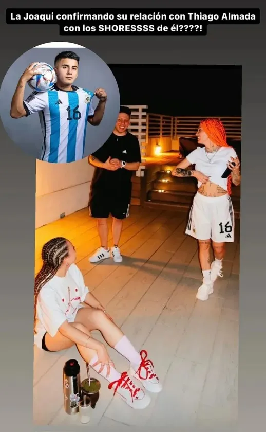 Es que la exponente del RKT en Argentina publicó una foto utilizando el short de la Albiceleste con el dorsal #16 de Thiago Almada, con quien había sido vinculada por la prensa. Esto no hizo más que alimentar el ruido que generaron los primeros indicios y, de alguna manera, dio a entender que La Joaqui estaba atenta a lo que se habla en la farándula nacional.