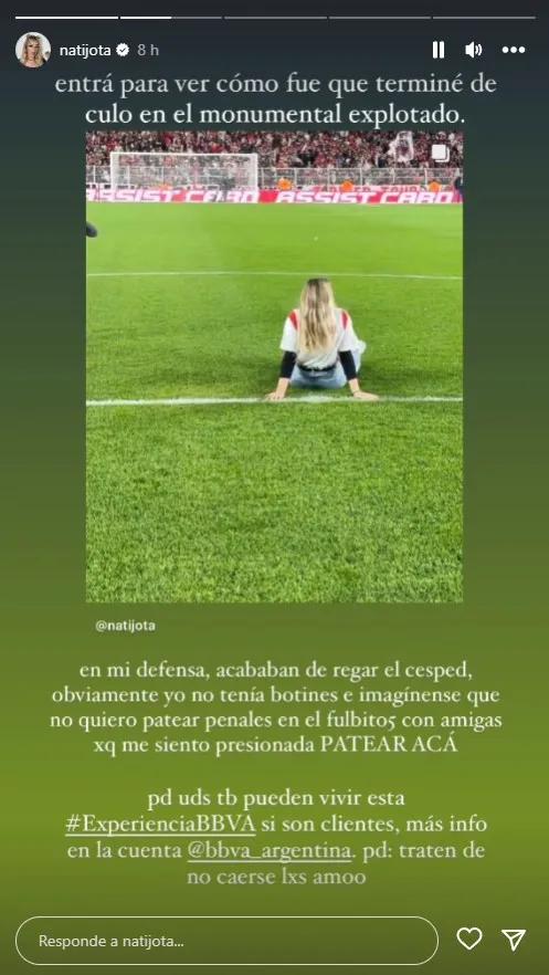 “En mi defensa, acababan de regar el césped y no tenía botines”, escribió posteriormente Nati Jota luego de que se viralizara su blooper ante un Monumental repleto. Puede pasar…