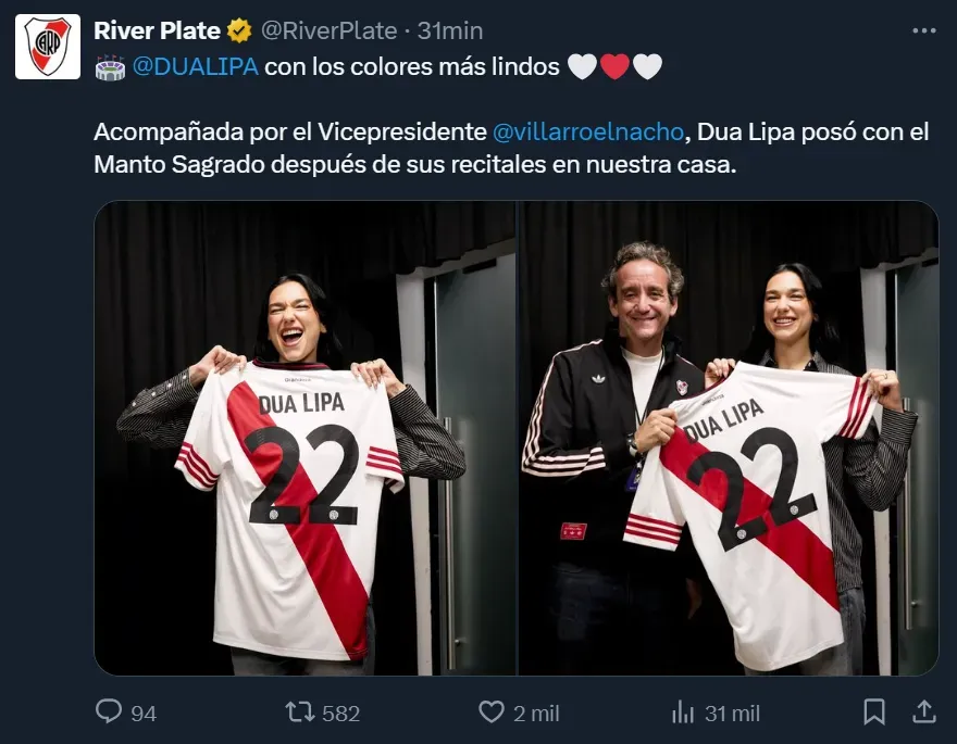 El viernes 7 y el sábado 8 de noviembre, Dua Lipa se presentó en el Estadio Monumental ante más de 70 mil espectadores cada noche. Este domingo por la mañana, desde River compartieron unas imágenes en las que la artista posaba junto a Ignacio Villarroel -vicepresidente segundo- con una camiseta del Millonario. La misma tenía el dorsal número 22.