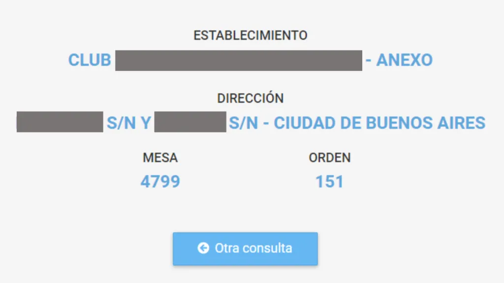 Una vez completados esos datos, tenés que presionar “Continuar”, y automáticamente aparecerá en tu pantalla el establecimiento donde te toca votar, su dirección, y la mesa y orden de tu turno. Aquí debajo, un ejemplo: