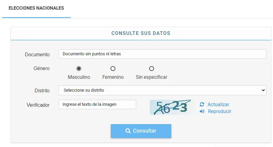 Como se ve en la imagen, tenés que llenar los casilleros de “Documento” y “Género”, seleccionar tu provincia en el apartado “Distrito”, y escribir en el espacio “Verificador” el código de 4 dígitos que se aprecia en la imagen correspondiente.