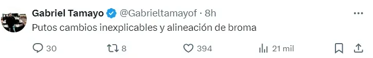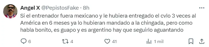 Luego de perder el clásico ante América por 1 a 0 con tanto de Ramón Juárez Del Castillo, fueron varios los hinchas de Chivas que volcaron sus críticas en las redes sociales. Para algunos no acertó en los cambios, para otros nunca debió haber llegado y la crítica más despiadada fue cuando dijeron que hay que seguir aguantándolo por ser argentino y guapo, que si fuese mexicano ya lo hubiese echado.