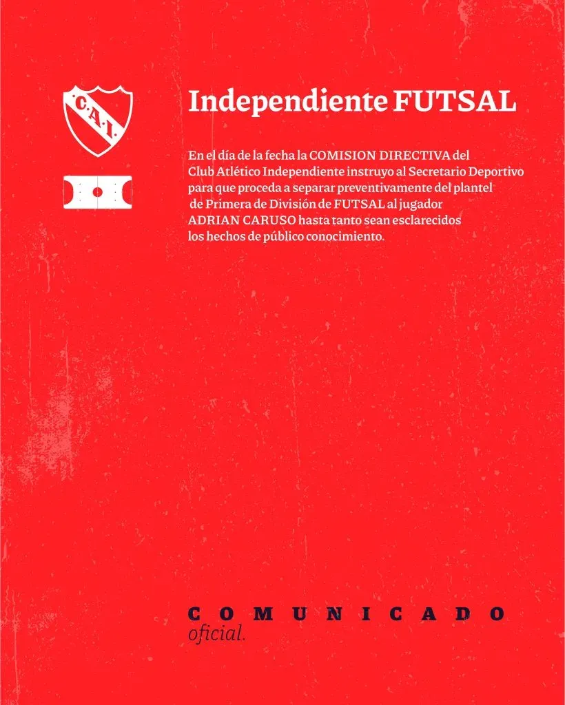 “Independiente vs. River. Hay entraditasss. Popular y platea. Dale dale se te escapaa”, había compartido en sus redes Caruso. Al tomar conocimiento, el Rojo sacó un comunicado diciendo: “La Comisión Directiva del Club Atlético Independiente instruyó al Secretario Deportivo para que proceda a separar preventivamente del plantel al jugador ADRIÁN CARUSO hasta tanto sean esclarecidos los hechos de público conocimiento”.