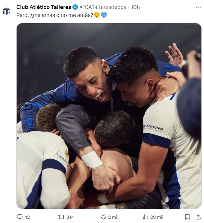 Una vez consumado el triunfo, en las redes sociales oficiales de Talleres se hicieron eco de uno de los temas de actualidad del momento: la filtración de los videos de Alberto Fernández con Tamara Pettinato. El CM del conjunto cordobés compartió una foto del festejo grupal y lo acompañó con: “Pero, ¿me amás o no me amás?”, exactamente la misma frase que se le ve decir al ex Presidente de la República Argentina a la periodista mientras estaba sentada en el Sillón de Rivadavia.