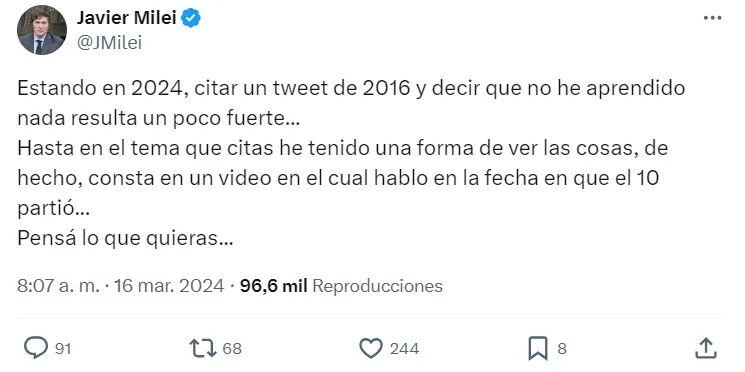 Javier Milei le respondió al usuario que lo cuestionó por aquella falta de respeto a Diego y se expresó: “Estando en 2024, citar un tweet de 2016 y decir que no he aprendido nada resulta un poco fuerte… Hasta en el tema que citás he tenido una forma de ver las cosas, de hecho, consta en un video en el cual hablo en la fecha en que el 10 partió… Pensá lo que quieras”.