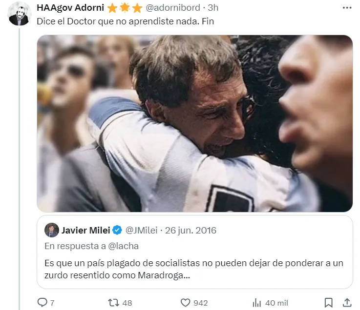Minutos más tarde, el usuario @adornibord -una cuenta parodia- le respondió con una foto de Bilardo y Maradona abrazados. Además, citó un tuit del actual presidente en el cual le faltó duramente el respeto a Pelusa. El mismo decía: “Es que en un país plagado de socialistas no pueden dejar de ponderar a un zurdo resentido como Maradroga…”.