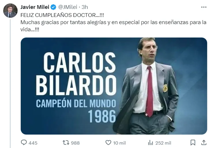 Este sábado, Carlos Salvador Bilardo cumple 86 años y Javier Milei aprovechó para saludarlo en su cuenta de Twitter. El Presidente posteó una foto del Narigón y lo acompañó con una frase: “FELIZ CUMPLEAÑOS DOCTOR…!!! Muchas gracias por tantas alegrías y en especial por las enseñanzas para la vida..!!!”.