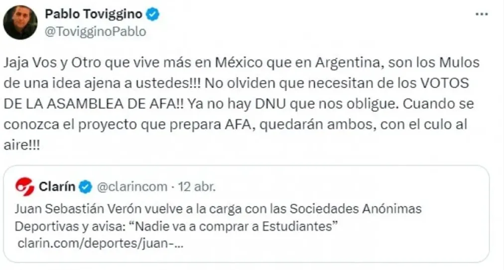 Fiel a su estilo polémico, Pablo Toviggino -Tesorero de la AFA- utilizó sus redes sociales para responderles a Verón y Fassi y lo hizo de una mano poco apropiada para un dirigente de la AFA: “Jaja, vos -por Verón- y el otro que vive más en México por Argentina -por Fassi- son los mulos de una idea ajena a ustedes!!! No olviden que necesitan LOS VOTOS DE LA ASAMBLEA DE LA AFA!! Ya no hay DNU que nos obligue. Cuando se conozca el proyecto que prepara AFA, quedarán ambos, con el culo al aire!!!”.