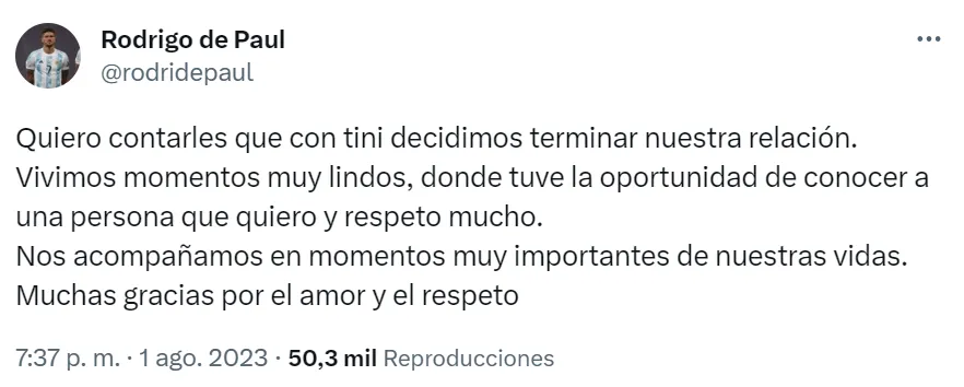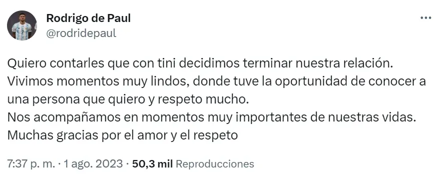 “Quiero contarles que con Tini decidimos terminar nuestra relación. Vivimos momentos muy lindos, donde tuve la oportunidad de conocer a una persona que quiero y respeto mucho. Nos acompañamos en momentos muy importantes de nuestras vidas. Muchas gracias por el amor y el respeto”, escribió el mediocampista que se desempeña en Atlético de Madrid a través de su cuenta de Twitter, mientras que la cantante publicó el mismo mensaje.