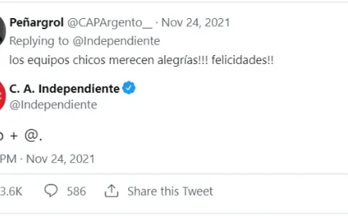 La cuenta @CAPArgento_, conocido por ser hincha de Boca y de Peñarol, respondió el palito diciendo que el Rojo era un “equipo chico”. La respuesta de Independiente explotó las redes: “Ratio + @”, en referencia a que el tuitero perdió su nombre de usuario original (@CAPArgento) hace unas semanas. ¡Lo liquidó!