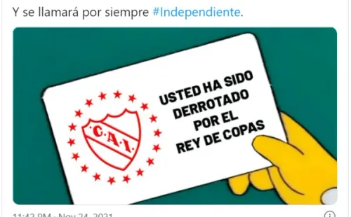 “Usted ha sido derrotado por el Rey de Copas”, fue lo primero que publicó la cuenta de Independiente, agregando la frase “Y se llamará siempre Independiente”. Más allá de esta ingeniosa chicana, lo mejor llegó cuando le respondieron a un fanático del Xeneize.