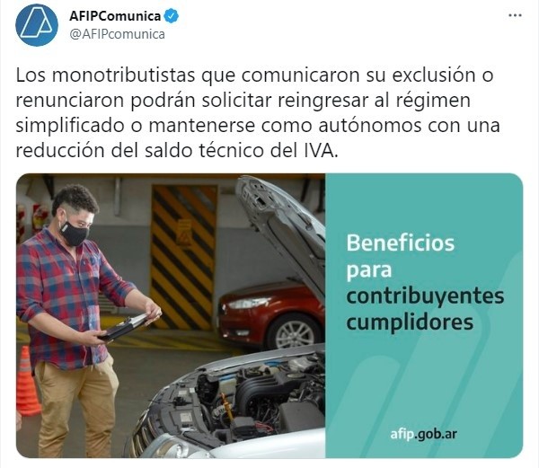 Pero no es lo único a resaltar de la resolución, porque también laAFIPconfirmó quehasta el 31 de julio estarán habilitados una serie de beneficios previstos en el Régimen de Sostenimiento e Inclusión Fiscal para Pequeños Contribuyentes. Aquellas personas que comunicaronsu exclusión o renunciaron al monotributo para convertirse en autónomos entre los días1° de octubre de 2019 y el 31 de diciembre de 2020, tienen la chance de poderadherirse otra vez al régimen simplificado o acceder a una reducción del saldo técnico de IVA.