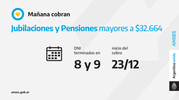 - Mañana cobran los documentos terminados en 8 y 9 cuyos haberes alcancen la suma de 32.664 pesos.