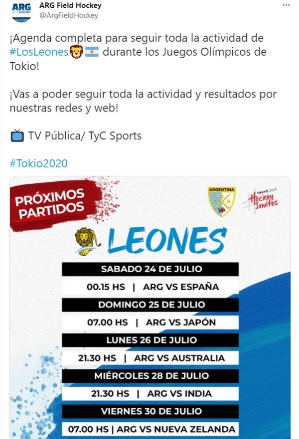 Dentro de lo que será una amplia jornada de deportes con participación de la delegación albiceleste, lo cierto es que laSelección Argentina de Hockey, mejor conocidos comoLos Leones, se estarán enfrentando aEspañapor la primera fecha delGrupo AdelHockey masculinopor la ediciónTokio 2020de losJuegos Olímpicos. El juego tendrá lugar estesábado 24 de juliodesde las0:15 hora argentinacon transmisiónEN VIVOyEN DIRECTOdeTyC SportsyTV Pública.