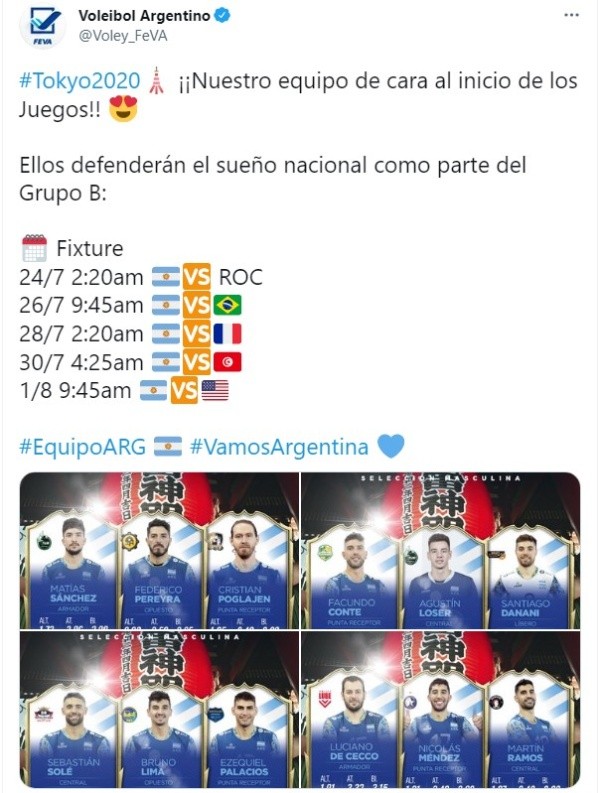 En cuanto al pasaje logrado a Tokio, el mismo lo obtuvo después de haber culminado enprimer lugar del Torneo Preolímpicoal compartir grupo junto a Canadá, China y Finlandia. Los representantes albicelestes son los armadoresLuciano De Cecco y Matías Sánchez, los opuestosBruno Lima y Federico Pereyra, los centralesSebastián Solé, Martín Ramos y Agustín Loser, los puntas receptoresFacundo Conte, Cristian Poglajen, Ezequiel Palacios y Nicolás Méndez y el líberoSantiago Danani.