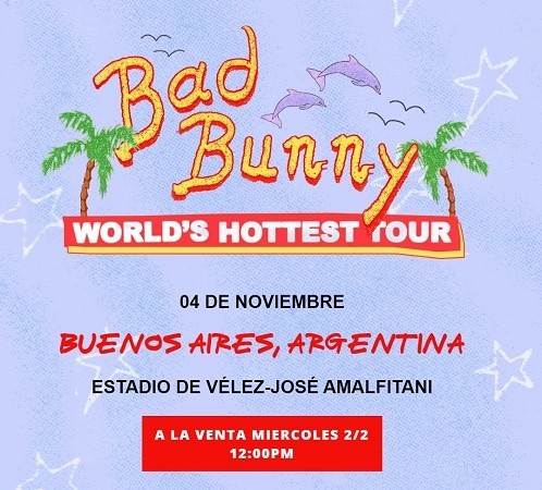 El artista puertoriqueño, Bad Bunny regresa a nuestro país para realizar un show en el marco del “World’s Hottest Tour”, su primera gira en estadios. La presentación será el 4 de diciembre en el estadio de Vélez Sarsfield, en el barrio de Liniers, Buenos Aires.