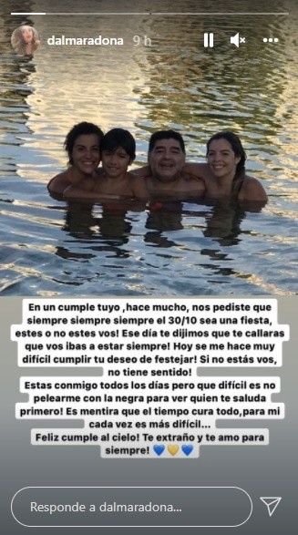 Por su parte, Gianinna subió una foto con un “La vida por abrazarte así de nuevo”. Claudia Villafañe, la madre de ambas, también le habló a Diego: “Donde estoy ya es 30 de octubre. ¡Feliz cumple al cielo! ¡Sé que todo lo ves!”.