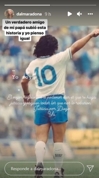 Dalma también compartió el mensaje de un maradoniano. “Un verdadero amigo de mi papá subió esta historia y yo pienso igual”, sostuvo. La frase era: “El mejor regalo que le podemos dar es que se haga justicia y paguen todos los que nos lo robaron. Justicia por Diego. Ya”.