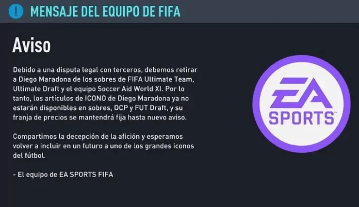“Debido a una disputa legal por parte de terceros, debemos suspender a Diego Maradona de los packs de FIFA Ultimate Team, de Ultimate Draft y del equipo Soccer Aid World XI. Por lo tanto, los ítems de icono de Diego Maradona ya no estarán disponibles en packs, DCP y FUT Draft y su rango de precios quedará en su valor actual hasta nuevo aviso.Compartimos la decepción que sienten nuestros seguidores y esperamos poder volver a incorporar a uno de los mayores iconos del fútbol mundial en el futuro“.