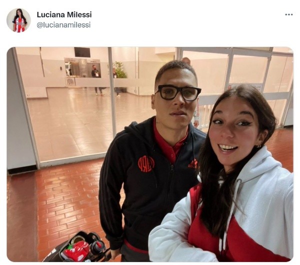 A pesar de que no pudo ver brillar al equipo de Gallardo, como así tampoco a Julián Álvarez, Milessi se mostró en su cuenta de Twitter junto a otro de los cracks del Millo, y los hinchas se ilusionaron, ya que podría tratarse de un nuevo “trabajo” para mejorar los dotes futbolísticos del equipo. Y con quien estuvo siendo retratada fue nada más ni nada menos que con Juan Fernando Quintero.