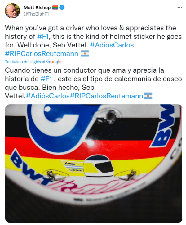 El multicampeón alemán llevará escrito en su casco un emotivo mensaje hacia Reutemann:“Adiós, Carlos”, junto a los colores de la bandera argetina. El hombre que milita en las filas de Aston Martin no se olvidó de Lole y lo llevará en su monoplaza durante el Gran Premio de Silverstone. ¡Grande, Seb!