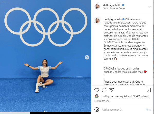 En Instagram, hizo un posteo dándole un cierre a una hermosa experiencia más allá de haber salido octava (último puesto) en las dos carreras que protagonizó: “Oficialmente nadadora olímpica, con TODO lo que eso significa. Ya habrá momento de hacer un balance del torneo y del proceso hasta acá. Mientras tanto, voy disfrutar de cumplir uno de mis tantos sueños: competir en un JUEGO OLÍMPICO con la bandera argentina. Se que esta vez me toca aprender y ganar experiencia. No es ningún antes y después, es parte de esta carrera y a partir de de mañana arranca un nuevo capítulo”, expresó.